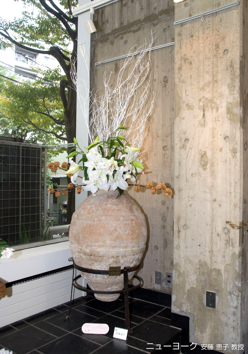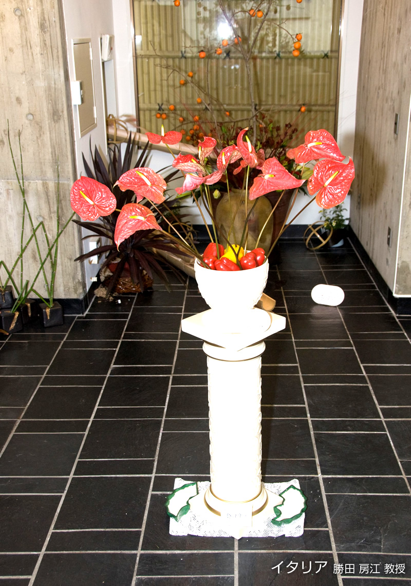 一階、二階のアートギャラリーには、ヨーロッパ、アメリカ、アジア、中近東など各国を表現した独創的でアーティスティックないけ花をはじめ、勝田教授を中心に皆で生けた柿や竹など日本情緒あふれる作品も展示されました。会場には優しい花の香りが漂い、世界中から集められた珍しい花器や、めったに見ることのできない花材など、あまり類をみない華展で、ご来場の方々は、まるで世界旅行をしているようだと、感嘆の声を上げられていました。