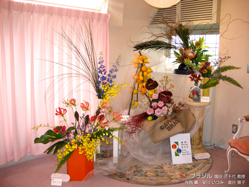 三階のサロンには、ブラジル移民100周年を記念して、外務省より使用認定を受けたロゴマークを飾り、6月にサンパウロでいけ花デモンストレーションを行った増田三千代教授を中心にブラジルコーナーとして数々の花を展示致しました。創始者・大野典子が「国際いけ花」をスタートさせた原点でもあるブラジルでは、多くの方々が国際いけ花支部を継続し活躍されています。
