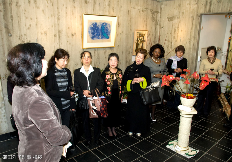 11月14日(金)から16日(日)の11時から7時まで(最終日は5時)、恒例の国際いけ花・秋の華展が南青山「花の城」で開かれました。今年は、「エキゾチックメモリー」と題しまして、世界の国々のイメージを花に託し、旅した日の思い出や、美しい地球への願いを秋の花々で表現いたしました。初日のオープニングには、「女性自身」誌の松崎敏弥さんに乾杯の音頭をお取りいただき、アンゴラ大使館のMs.Maria Teresa Felixにご挨拶いただき、秋の華展がスタート致しました。