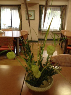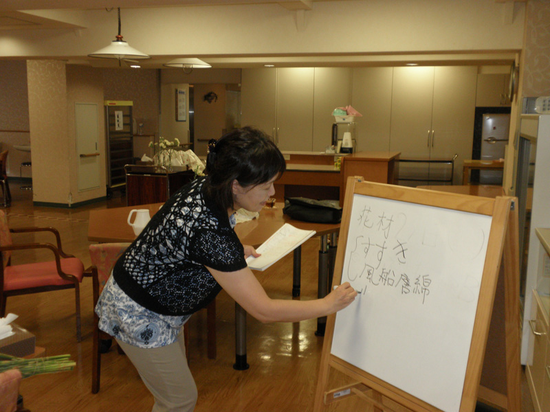 介護付有料老人ホーム「舞浜倶楽部」において、月一回、川ア和美教授の指導で国際いけ花のお教室が開かれています。すすき、フウセントウワタ、小菊などを生けた9月22日のお稽古風景を御紹介します。