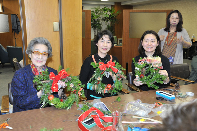 20日には、「クリスマス・リース」の講習会が開かれ、国際いけ花協会の伊藤洋子教授・安藤恵子教授等の指導で、モミノキや松ぼっくり、愛らしいオーナメント、リボンなどを飾り付け、素敵なミニリースが出来上がりました。参加者は、一足早いクリスマスの訪れに喜びを感じておられるご様子でした。