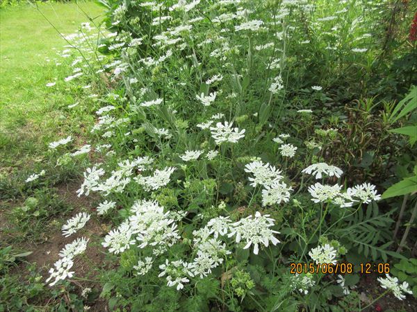 *初夏の花が咲くガーデンソイル *クナウティア *ニセアカシアの下に咲くスカビオサ(松虫草)やハクサンフウロ *ホリホック(立葵) *スモークツリー *デルフィニウム *オルラヤ *カンパニョーラプンクタータ(ほたるぶくろ) *青紫のハーブたち *ルドベキア