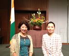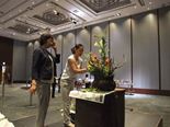 9月17日(木)18:30より、パレスホテルにおいてコートジボワール独立55周年記念の祝賀パーティーが開催されました。His Excellency Mr. Jerome Kloh WEYA大使ご夫妻より招待され、伊藤洋子教授、寺西薫教授、馬場美穂教授、増田三千代教授が出席しました。国際いけ花協会の増田副理事長と馬場教授がお祝いとして、国旗の色であるオレンジ・白・グリーンの花を中心に羅漢槙なども日本的な籠にゴージャスに生けました。壇上の国旗の横に飾られた花は、ひときわ華やかで、大使ご夫妻をはじめ出席された方々にお喜びいただきました。