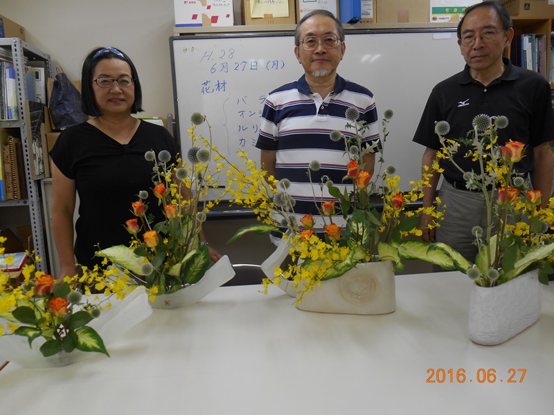 6月27日(月)に、神田神保町教室で蒲田洋子教授指導の「いけメン&レディーズ」クラスのレッスンがありました。バラ、オンシジウム、ルリタマアザミ、カミーラを、お洒落なデザインの花器に生けました。珍しい形の花器は初めての試みで、少し難しかったようですが初夏らしい作品に仕上がりました。