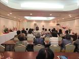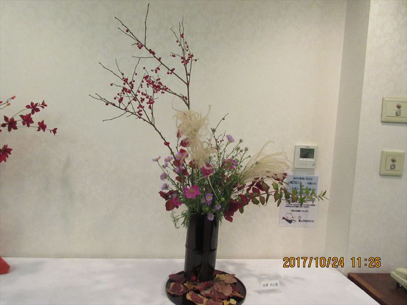 10月25日(水)12時〜15時、琴の音の流れる花いっぱいの会場で楽しいランチョンパーティーが開催されました。美味しいお食事の後は、増田三千代教授、鈴木康子教授、星野陽子教授の三人が日本の美を表現したいけ花デモンストレーションを披露しました。緑と朱色の帯を大胆に使い、竹籠にそれぞれ華やかに深まりゆく秋を表現し、大きな拍手を受けました。最後にビンゴゲームを楽しみ、心の和む良きイベントとなりました。