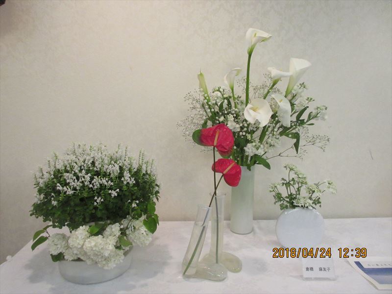 4月20日(金)から22日(日)まで中野ゼロホール で中野区茶道華道連盟が中野文化展に参加しました。国際いけ花協会から増田三千代教授が参加し、ガラスの器に 手毬草、カラー、バンダをいけました。初夏を感じさせるスッキリとした国際いけ花らしい作品に仕上がりました。